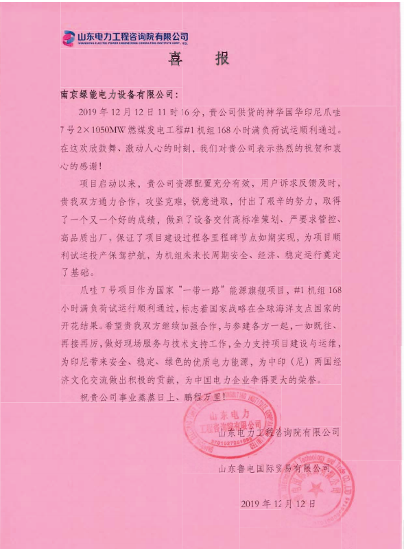 熱烈祝賀神華國華印尼爪哇2×1050MW燃煤機組項目,一號機組順利通過168小時滿負荷試運行!爪哇7號項目作為國家“一帶一路”能源旗艦項目,感謝業(yè)主方對我公司產品的信任.